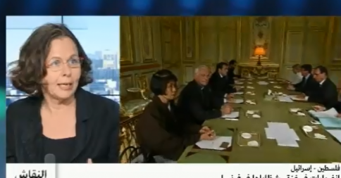في حلقة النقاش على فرانس 24 التي كان موضوعها حظر المظاهرات الموالية للفلسطينيين في باريس من وجهة نظر القانون ومبادئ حرية التعبير، والتي استضافت ناشطة إسرائيلية ومتخصص مصري بالقانون الدولي، اتهمت الناشطة الإسرائيلية بلادها بارتكاب جرائم حرب في غزة في حين دافع الضيف العربي عن الكيان الصهيوني واعتبر أن له الحق بالدفاع عن نفسه ضد حركة “حماس الإرهابية” على حد قوله.