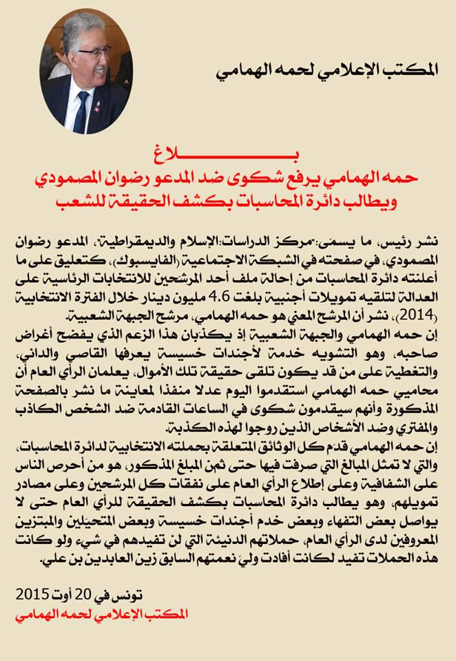 وقد أصدر مكتب الإعلام هذا البيان متضمّنا دعوةً لدائرة المحاسبات لكشف الحقيقة للرّأي العام حتى لا يقع مثل هذه الاتّهامات مستقبلا، وأكّد البيان أنّ السيد حمه الهمامي، الذي تعرّض لمثل هذا التشويه المقصود سيقدّم محاموه في الساعات القادمة شكوى ضدّ المسمّى رضوان المصمودي.