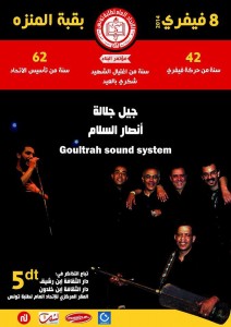 جيل جيلالة في تونس في ذكرى 8 فيفري المجيدة بمناسبة الذكرى الثانية والأربعين لحركة فيفري المجيدة والذكرى الأولى لاغتيال الشهيد شكري بلعيد ينظم الاتحاد العام لطلبة تونس تظاهرة يتخللها عرض موسيقي تحييه فرقة جيل جيلالة، قول تره، وأنصار السلام و ذلك بالقاعة المغطاة بالمنزه. UGET 2014-01-31 gybbs tweet