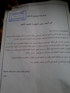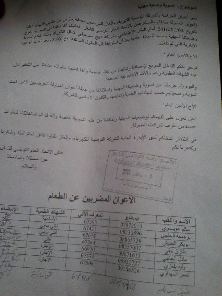 وتوجه المضربون برسالة الى الأمين العام للإتحاد العام التونسي للشغل من أجل تبني مطالبهم و إلى رئاسة الحكومة.