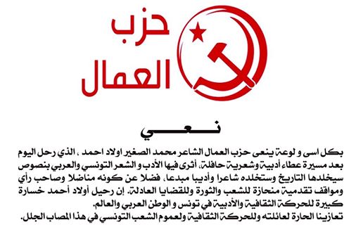 بكل اسى و لوعة ينعى حزب العمال الشاعر محمد الصغير اولاد احمد ، الذي رحل اليوم بعد مسيرة عطاء أدبية وشعرية حافلة، أثرى فيها الأدب و الشعر التونسي والعربي بنصوص سيخلدها التاريخ وستخلده شاعرا وأديبا مبدعا، فضلا عن كونه مناضلا وصاحب رأي ومواقف تقدمية منحازة للشعب والثورة وللقضايا العادلة. إن رحيل أولاد أحمد خسارة كبيرة للحركة الثقافية والأدبية في تونس و الوطن العربي والعالم. تعازينا الحارة لعائلته وللحركة الثقافية ولعموم الشعب التونسي في هذا المصاب الجلل.