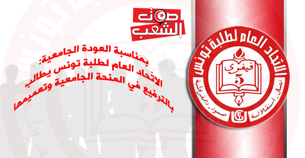 بمناسبة العودة الجامعية طالب الاتحاد العام لطلبة تونس في بيانه الصادر يوم 19 سبتمبر الجاري بالترفيع في المنحة الجامعية وتعميمها وتحسين وتطوير الخدمات الجامعية والترفيع في ميزانية العمل الثقافي.