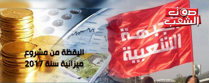 دعا المجلس المركزي للجبهة الشعبية في بيانه الصادر يوم 3 أكتوبر الجاري إلى “اليقظة حيال مشروع ميزانية الدولة لسنة 2017 الذي تضمّن نيّة الحكومة في تنفيذ حزمة من الإجراءات الجبائية والتدابير المالية التّي تنصّ على إثقال كاهل الأجراء والفئات الاجتماعية المتوسطة بزيادات جديدة في الضرائب على الدخل ومواد الاستهلاك والخدمات إلى جانب تجميد الأجور لمدّة ثلاث سنوات”.