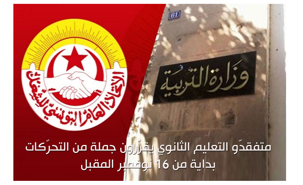 ويطالب الطرف النقابي بإصدار النظام الأساسي الخاص بمتفقدّي التعليم الثانوي والإعدادي وتفعيل بنود الاتفاق الممضى بتاريخ 4 ماي 2016 إضافة إلى صرف المستحقّات المالية المتصّلة بالتكوين والتنقّل.