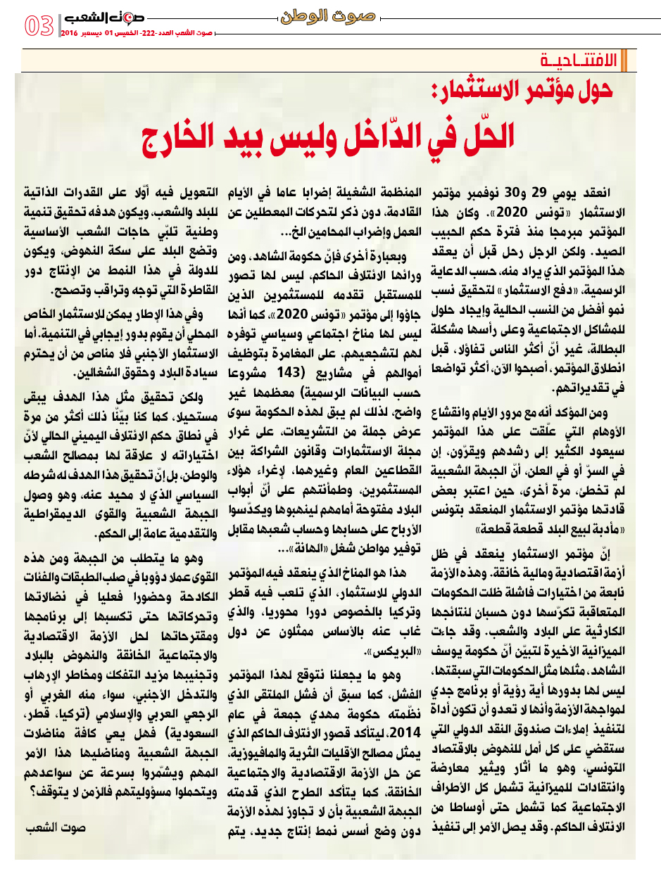 انعقد يومي 29 و30 نوفمبر مؤتمر الاستثمار “تونس 2020″. وكان هذا المؤتمر مبرمجا منذ فترة حكم الحبيب الصيد. ولكن الرجل رحل قبل أن يعقد هذا المؤتمر الذي يراد منه، حسب الدعاية الرسمية، “دفع الاستثمار” لتحقيق نسب نمو أفضل من النسب الحالية وإيجاد حلول للمشاكل الاجتماعية وعلى رأسها مشكلة البطالة، غير أنّ أكثر الناس تفاؤلا، قبل انطلاق المؤتمر،أصبحوا الآن، أكثر تواضعا في تقديراتهم. ومن المؤكد أنه مع مرور الأيام وانقشاع الأوهام التي علّقت على هذا المؤتمر سيعود الكثير إلى رشدهم ويقرّون، إن في السرّ أو في العلن، أنّ الجبهة الشعبية لم تخطئ، مرة أخرى، حين اعتبر بعض قادتها مؤتمر الاستثمار المنعقد بتونس “مأدبة لبيع البلد قطعة قطعة”