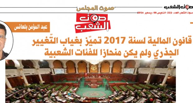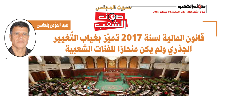 قال عبد المؤمن بلعانس النائب عن الجبهة الشعبية في تصريحه لـ”صوت الشعب” إنّ نوّاب الجبهة وبعد اطّلاعهم على تفاصيل قانون المالية لسنة 2017 لاحظوا غياب التّغيير الجوهري والجذري حتّى تكون إجراءاته منحازة إلى كافة الفئات الشعبية.