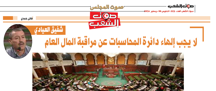 بعد مصادقة مجلس النوّاب على ميزانية الهيئة العليا المستقلة للانتخابات لسنة 2017 والمقدّرة بـ 67.280 مليون دينار، قال شفيق العيادي النائب عن الجبهة الشعبية في تصريحه لـ”صوت الشعب” إنّ هناك إشكال في نقطة المراقبة المالية الذي مثّل خلافا كبيراصلب لجنة الانتخابات، فهناك من دعا إلى مواصلة دائرة المحاسبات في الإشراف على كلّ ما يتعلّق بالجوانب المالية للانتخابات.