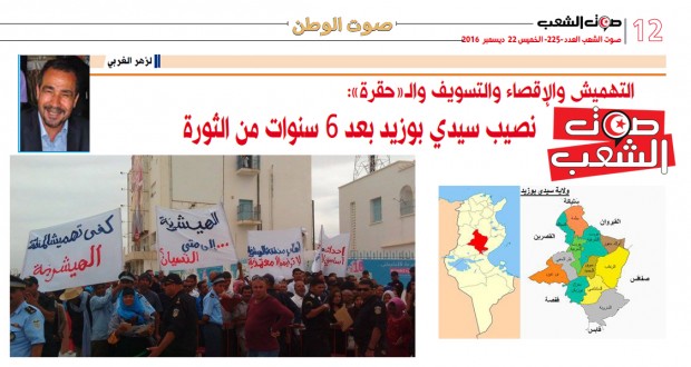 لكلّ ما تمّ ذكره بخصوص الوضع التنموي للجهة، في السنة السادسة التي تلي ثورة الحرية والكرامة والعدالة الاجتماعيّة، مازالت سيدي بوزيد، المدينة التي انطلق منها سيل الثورة المبارك، تعاني الأمرّين، بل إنّ أوضاعها ازدادت سوءا على سوءٍ. فهي مثل سائر الجهات الداخلية المنسية والمهمّشة محرومة من مقومات التنمية المستدامة التي من شأنها توفير أسباب العيش الكريم لسكان الجهة ولشباب الثورة،فالفساد استشرى في مفاصل الإدارة، وانسدّت آفاق النهوض الاجتماعي وأوصدت أبواب التشغيل في وجه المعطلين والمعطلات. وتوقفت عجلة الاقتصاد.