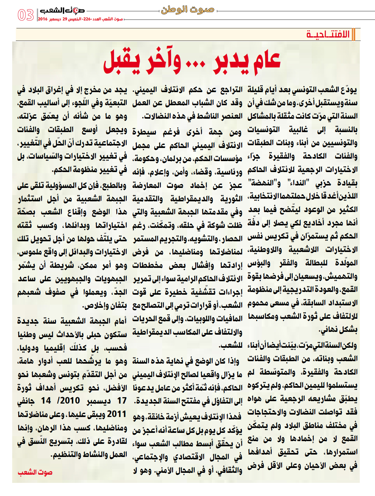 يودّع الشعب التونسي بعد أيام قليلة سنة ويستقبل أخرى. ومامن شك في أن السنة التي مرّت كانت مثقلة بالمشاكل بالنسبة إلى غالبية التونسيات والتونسيين من أبناء وبنات الطبقات والفئات الكادحة والفقيرة جرّاء الاختيارات الرجعية للائتلاف الحاكم بقيادة حزبي “النداء” و”النهضة” اللذين أغدقا خلال حملتهما الانتخابية، الكثير من الوعود ليتّضح فيما بعد أنها مجرد أخاديع لكي يصلا إلى دفّة الحكم ثم يستمرّان في تكريس نفس الاختياراتاللاشعبيةواللاوطنية، المولّدة للبطالة والفقر والبؤس والتهميش، ويسعيان إلى فرضها بقوة القمع، والعودة التدريجية إلى منظومة الاستبداد السابقة، في مسعى محموم للالتفاف على ثورة الشعب ومكاسبها بشكل نهائي.