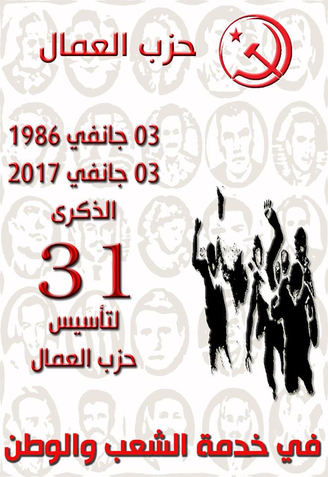 تمرّ اليوم 31 عاما على إعلان تأسيس حزب العمال، يوم 3 جانفي 1986، الذييصادف الذكرى الثانية لانتفاضة الخبز التي واجهها نظام حزب الدستور الدكتاتوري والفاسد بالحديد والنار والتي فرضت على الطّلائع الثورية آنذاك التّسريع ببعث حزب الطبقة العاملة لتنظيم النضال ضد مضطهدي العمال وعموم الشعب الكادح والمفقّر، من أجل تحريرهم من الاستغلال والقهر،فكان ميلاد حزب العمال الذي لم يدّخر مناضلاته ومناضلوه حبّة عرق واحدة للدفاع عن التونسيات والتونسيين بمافي ذلك في أحلك فترات دكتاتورية بورقيبة والمخلوع بن علي.