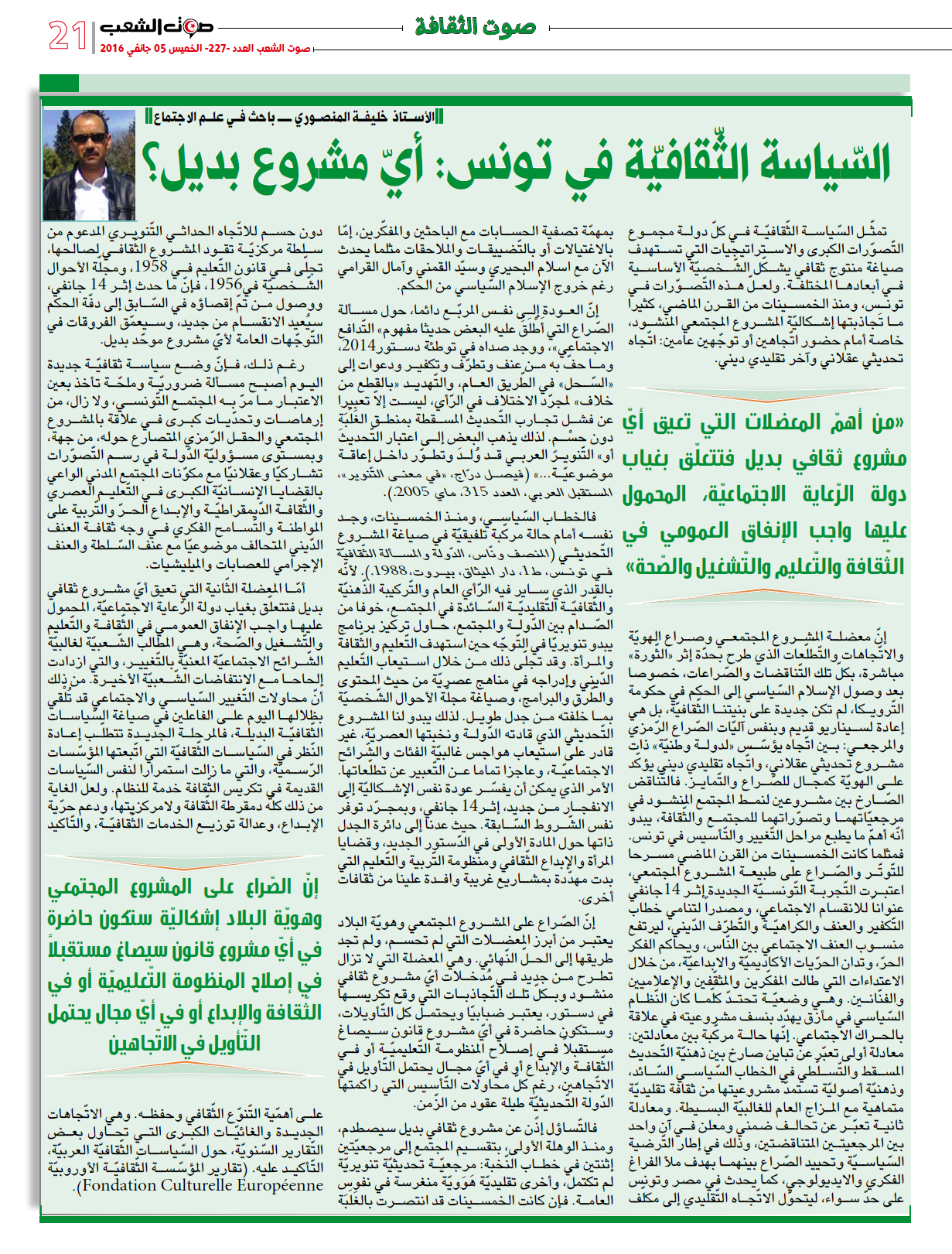 رغم ذلك، فإنّ وضع سياسة ثقافيّة جديدة اليوم أصبح مسألة ضروريّة وملحّة تأخذ بعين الاعتبار ما مرّ به المجتمع التّونسي، ولا زال، من إرهاصات وتحدّيات كبرى في علاقة بالمشروع المجتمعي والحقل الرّمزي المتصارع حوله، من جهة، وبمستوى مسؤوليّة الدّولة في رسم التّصوّرات تشاركيّا وعقلانيّا مع مكوّنات المجتمع المدني الواعي بالقضايا الإنسانيّة الكبرى في التّعليم العصري والثّقافة الدّيمقراطيّة والإبداع الحرّ والتّربية على المواطنة والتّسامح الفكري في وجه ثقافة العنف الدّيني المتحالف موضوعيّا مع عنف السّلطة والعنف الإجرامي للعصابات والميليشيات.