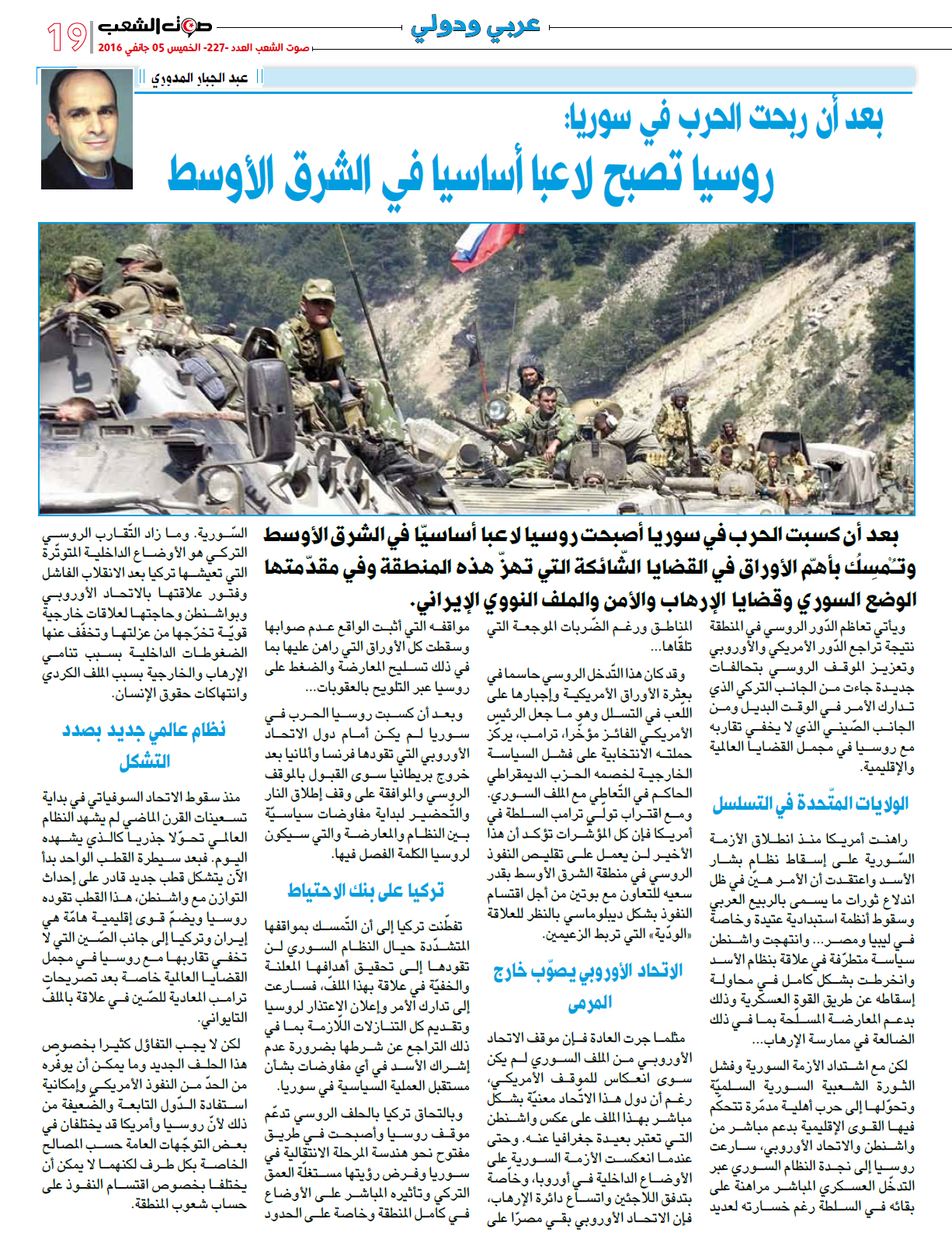 بعد أن كسبت الحرب في سوريا أصبحت روسيا لاعبا أساسيّا في الشرق الأوسط وتـُمْسِكُ بأهمّ الأوراق في القضايا الشّائكة التي تهزّ هذه المنطقة وفي مقدّمتها الوضع السوري وقضايا الإرهاب والأمن والملف النووي الإيراني.untitled-5