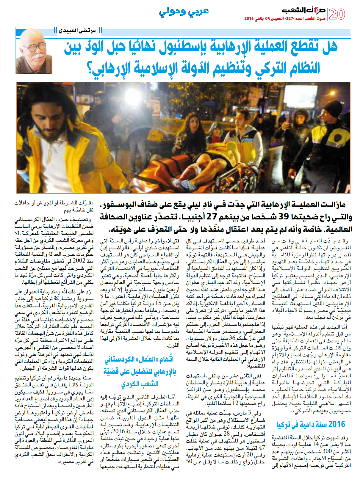 مازالت العملية الإرهابية التي جدّت في نادٍ ليلي يقع على ضفاف البوسفور، والتي راح ضحيتها 39 شخصا من بينهم 27 أجنبيا، تتصدّر عناوين الصحافة العالمية، خاصّة وأنه لم يتم بعد اعتقال منفّذها ولا حتى التعرّف على هويّته. وقد جدّت العملية في وقت من المفروض أن تكون حالة التأهّب في أقصى درجاتها، نظرا لرمزية المناسبة في حدّ ذاتها، وخاصّة بعد التهديد الصّريح لتنظيم الدولة الإسلامية الإرهابي، الذي أصبح يعتبر تركيا أرض جهاد، نظرا لمشاركتها في الائتلاف الدولي ضدّ داعش. أضف إلى ذلك أن الدماء التي سالت في العمليّتين الإرهابيتين اللّتين استهدفتا كنيسة قبطيّة في مصر وسوقًا لأعياد الميلاد في برلين لم تجفّ بعد.