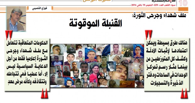 كما نرى فإنّ جميع هذه الحكومات تتعامل مع ملف شهداء وجرحى الثورة إعلاميا فقط من أجل الدعاية السياسية ليس إلا، أما عمليا فهي تتجاهله وتتقاذفه وكأنّه مرض معد تريد التخلص منه على وجه السرعة حتى تتخلّص من كابوس الثورة. إنه قنبلة موقوتة سوف ينفجر في وجه أعدائها طال الزمان أو قصر…