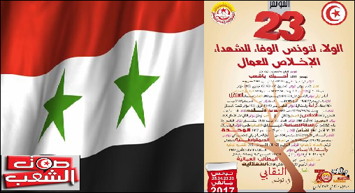 خلال أشغال اليوم الثالث للمؤتمر 23 للاتحاد العام التونسي للشغل، دعا عدد من النواب في بيانهم الموجّه للمكتب التنفيذي بالوضوح في موقفه مع الدولة السورية وأن يدفع في اتّجاه فتح سفارتها في تونس واعادة العلاقات بين البلدين.كما دعا النواب المكتب التنفيذي الوطني بعد انتخابه إلى تشكيل وفد نقابي رفيع المستوى يتوجّه إلى سوريا للتعبير بشكل ملموس عن مساندة الاتّحاد لسوريا.