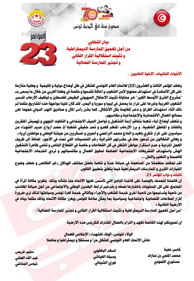 وقد تم توزيع هذا البيان على النواب داخل قاعة مؤتمر اتحاد الشغل . وطالب البيان الانتخابي للقائمة بضرورة إقرار إصلاحات اقتصادية واجتماعية وسياسية بما يمثل مناعة لتونس ويعزز مكانة الاتحاد مثلما تم تأكيده في الأرضية النقابية. وتعهّدت هذه القائمة بالعمل على تطبيق ما جاء في الأرضية في صورة انتخاب أعضاءها من قبل نواب المؤتمر.
