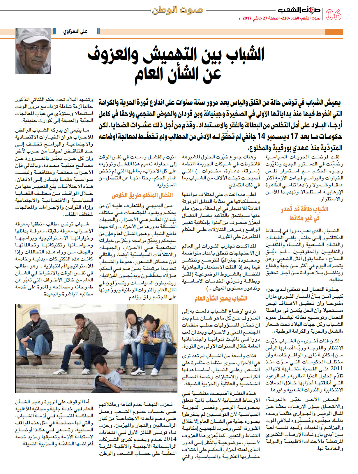 يعيش الشباب في تونس حالة من القلق واليأس بعد مرور ستّ سنوات على اندلاع ثورة الحرية والكرامة التي انخرط فيها منذ بداياتها الأولى في الصخيرة وجبنيانة وبن قردان والحوض المنجمي ولاحقا في كامل أرجاء البلاد على أمل التخلص من البطالة والفقر والاستبداد. وقدّم من أجل ذلك عشرات الضحايا. لكن حكومات ما بعد 17 ديسمبر 14 جانفي لم تحقّق له الأدنى من المطالب ولم تخطّط لمعالجة أوضاعه المتردّية منذ عهدي بورقيبة والمخلوع.
