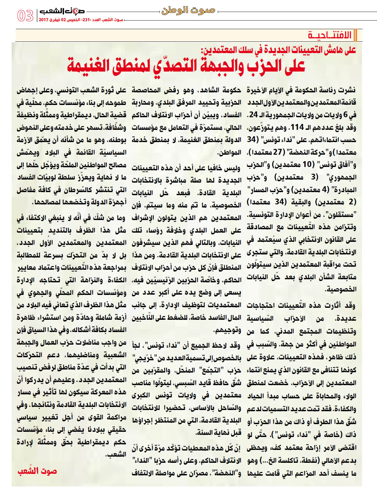 وما من شكّ في أنّه لا ينبغي الاكتفاء في مثل هذا الظرف بالتنديد بتعيينات المعتمدين والمعتمدين الأُول الجدد، بل لا بدّ من التحرّك بسرعة للمطالبة بمراجعة هذه التّعيينات واعتماد معايير الكفاءة والنزاهة التي تحتاجه الإدارة ومؤسّسات الحكم المحلّي والجهوي في مثل هذا الظرف الذي تعاني فيه البلاد من أزمة شاملة وحادّة ومن استشراء ظاهرة الفساد بكافة أشكاله. وفي هذا السياق فإن من واجب مناضلات حزب العمال والجبهة الشعبية ومناضليهما، دعم التحرّكات التي بدأت في عدّة مناطق لرفض تنصيب المعتمدين الجدد، وعليهم أن يدركوا أنّ هذه المعركة سيكون لها تأثير في مسار الانتخابات البلدية القادمة ونتائجها، وفي مراكمة القوى من أجل تغيير سياسي حقيقي ببلادنا يفضي إلى بناء مؤسّسات حكم ديمقراطية بحقّ وممثّلة لإرادة الشعب.