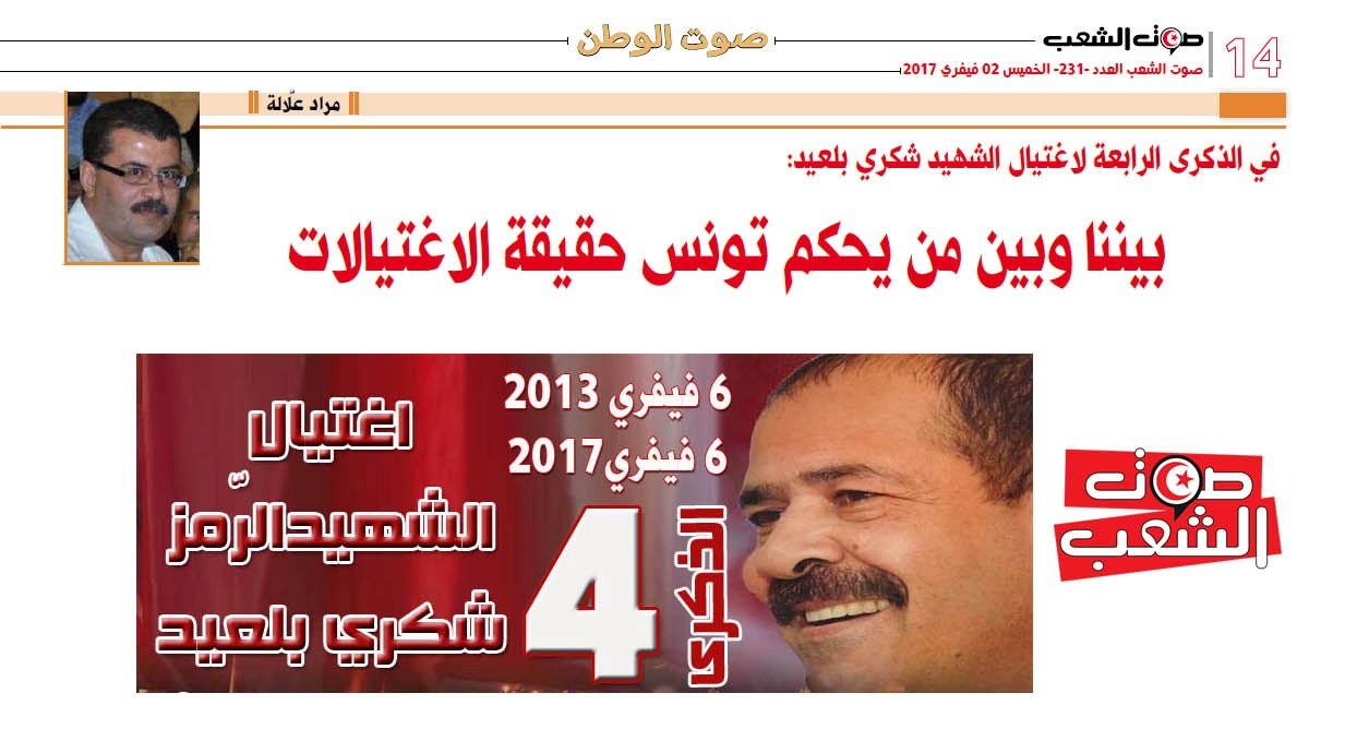 في هذا الإطار تحرِّكنا الذكرى التي لم تغب عنّا يوما ونجد من الوجاهة التوقّف مجدّدا عند دلالاتها وعند الدروس الواجب استخلاصها من مسيرة شكري بلعيد أربع سنوات بعد اغتياله، لم يشأ فيها حكّام تونس الجدد فعل ما يلزم لكشف الحقيقة.