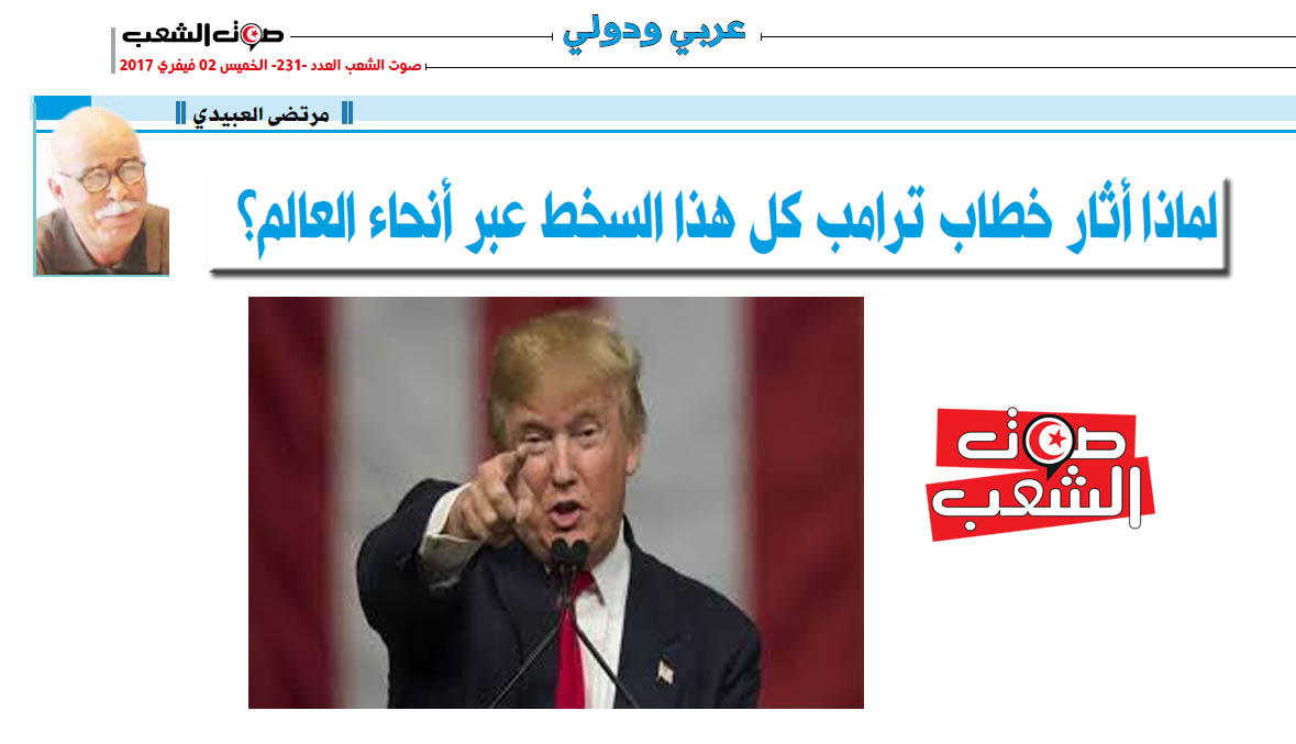 في العشرين من شهر جانفي الماضي، تسلم الميلياردير دونالد ترامب مقاليد رئاسة الولايات المتحدة الأمريكية بعد فوزه على منافسته هيلاري كلينتون. وقد صاحبت مراسم تنصيبه مظاهرات عارمة في كبرى المدن الأمريكية والعواصم العالمية، لعلّ من أهمّها المظاهرة النسائية في واشنطن والتي حشدت ما لا يقل عن نصف مليون امرأة.