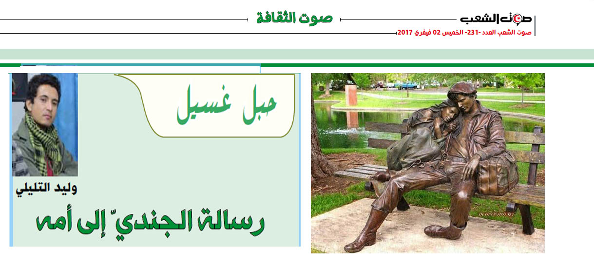 لن أحتمل حتما أيّ خبر سيّء، فاضحكي لي أرجوك كي أصدّق أنّ الشّيْب الذي في شعري سيختفي بعد أن تحمّمينني في قصعة الصّابون كما في أيّام الآحاد عندما كنت في المدرسة، وأنّ أسناني التي يأكلها البرد والسّوس ستنمو مكانها أسنان أخرى بيضاء ولامعة، وأنّ الألغام المزروعة هنا وهناك ستنبت مكانها أقحوانات وشقائق نعمان…