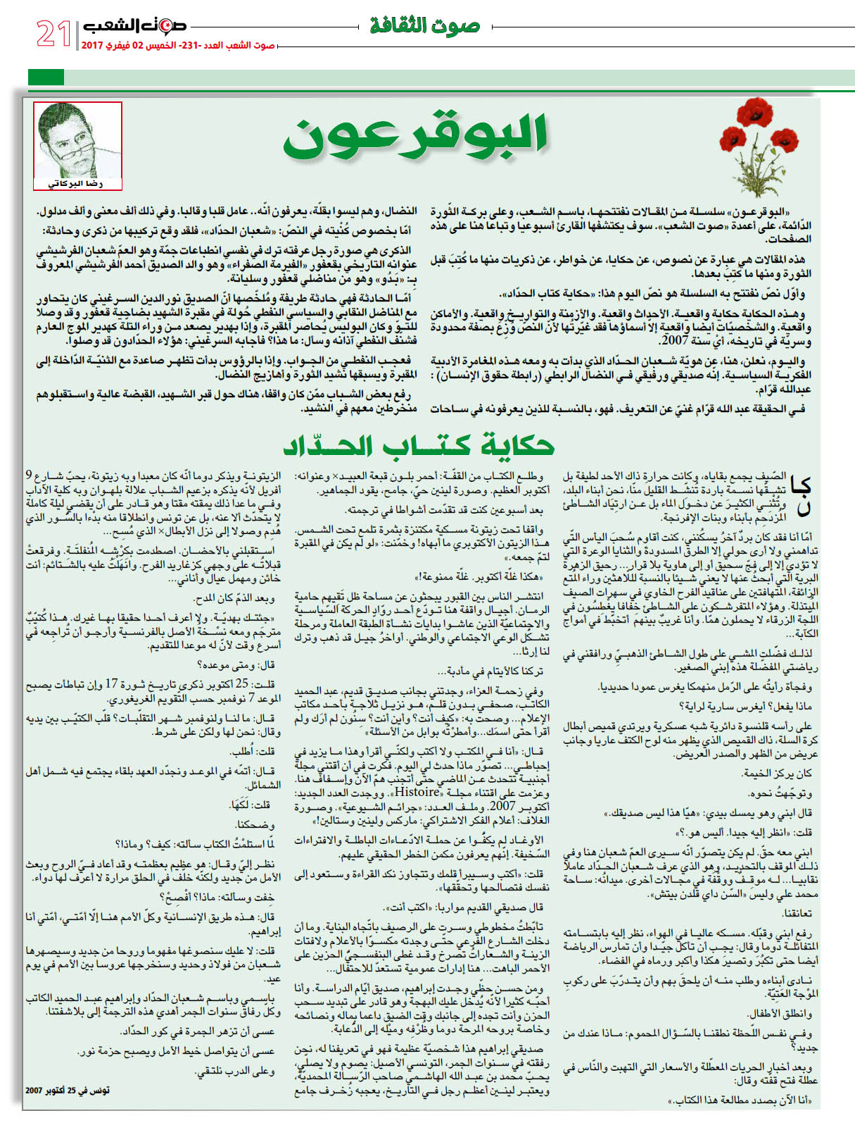 واليوم، نعلن، هنا، عن هويّة شعبان الحدّاد الذي بدأت به ومعه هذه المغامرة الأدبية الفكرية السياسية. إنّه صديقي ورفيقي في النضال الرابطي (رابطة حقوق الإنسان) : عبدالله قرّام.