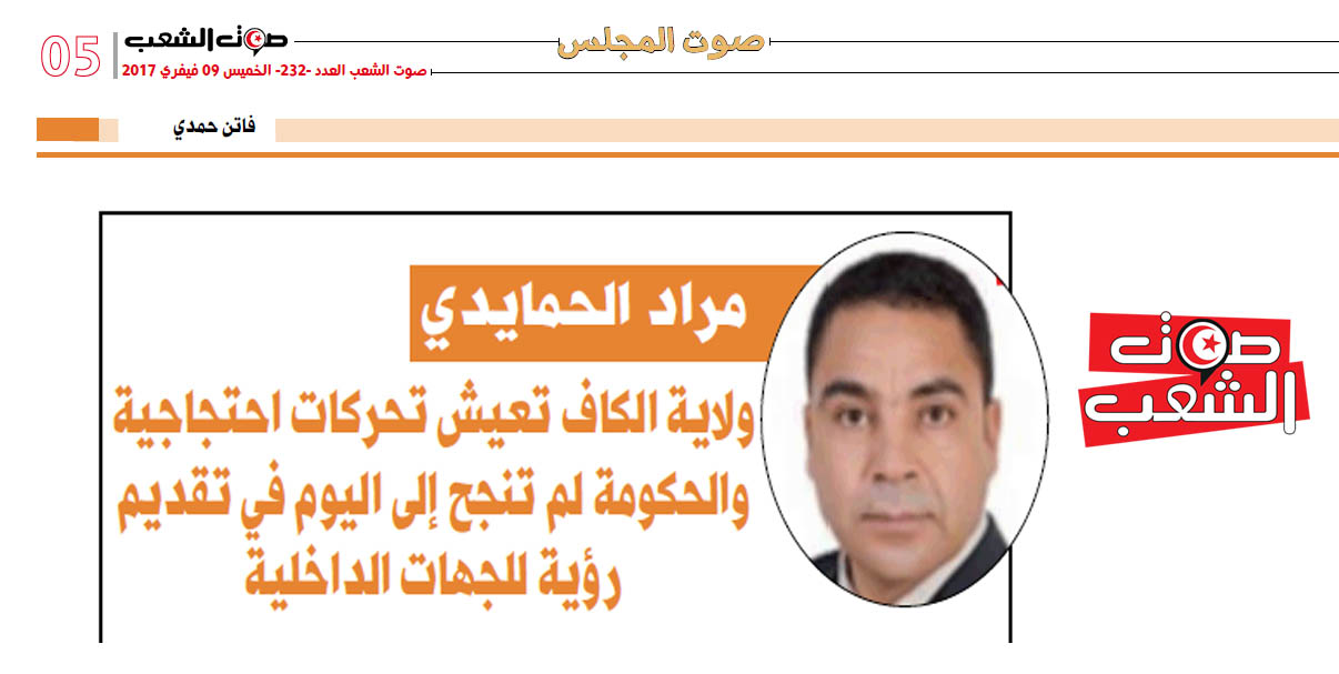 قال مراد الحمايدي النائب عن الجبهة الشعبية في تصريحه لـ”صوت الشعب” أنّ ولاية الكاف تعيش منذ فترة جملة من التحركات الاحتجاجية، ورغم ما وعد به رئيس الحكومة الحبيب الصيد بتشكيل لجنة للنظر في الوضع العام والخاص بالجهة إلاّ انّها لم ترى النّور بعد التحوير الحكومي، ورغم عديد المراسلات والتقارير من قبله بصفته نائبا بمجلس النواب ممثّلا عن الجهة إلاّ أنّ الحكومة لم تقدّم أية رؤية وأيّ برنامج للجهات الداخلية بل جلّ القوانين والإجراءات تصبّ في خانة لوبيّات معيّنة.