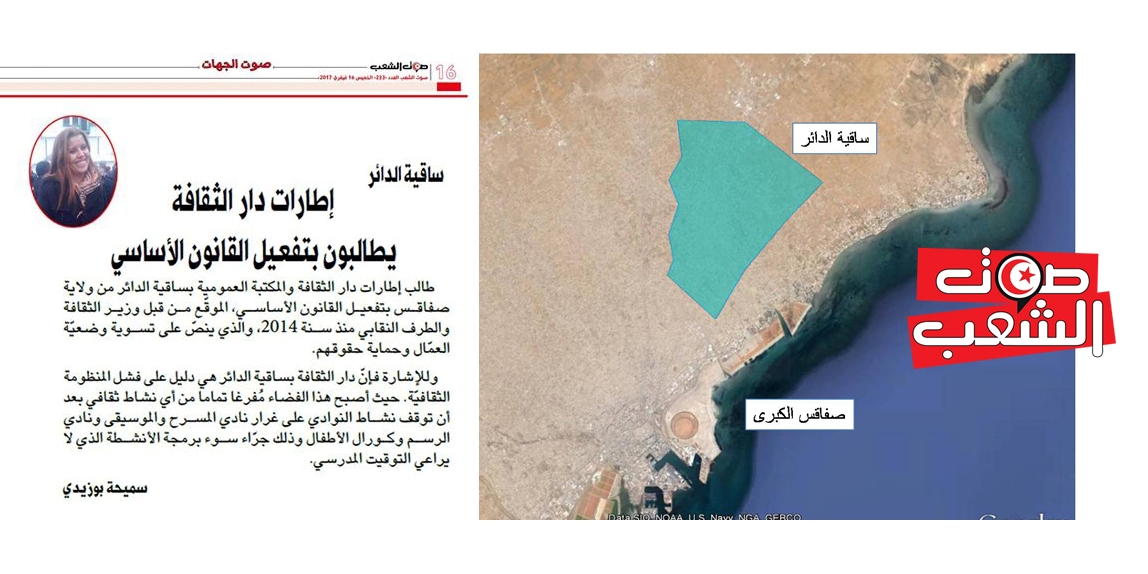 طالب إطارات دار الثقافة والمكتبة العمومية بساقية الدائر من ولاية صفاقس بتفعيل القانون الأساسي، الموقّع من قبل وزير الثقافة والطرف النقابي منذ سنة 2014، والذي ينصّ على تسوية وضعيّة العمّال وحماية حقوقهم.