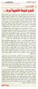 الجبهة الشعبية تمتلك اليوم كلّ مقوّمات النجاح، فقد حقّقت قدرا كبيرا من الوحدة والتّماسك الداخلي بين مختلف مكوّناتها، وفي نفس الوقت فهي تحظى بقدر هام من الاحترام والثّقة لدى فئات واسعة من الشعب، بفضل تضحياتها وتضحية شهدائها خاصة، ونظافة قياداتها وصدقيّتهم وإخلاصهم لوطنهم وشعبهم، ووضوح مواقفها ومبدئيّتها، وهذه العناصر، في ظلّ فشل الائتلاف الحاكم وعجزه عن تحقيق مطالب الشعب، تمثّل مكسبا هامّا على الجبهة استثماره لكي تُخرج تونس من الأزمة الخانقة الحاليّة وتضع حدّا لآلام الملايين من العمّال والكادحين والمعطّلين عن العمل والفقراء والمهمّشين. إن الأمر بيدها وبيد قياداتها فإن عزموا سيحقّقون المستحيل ….