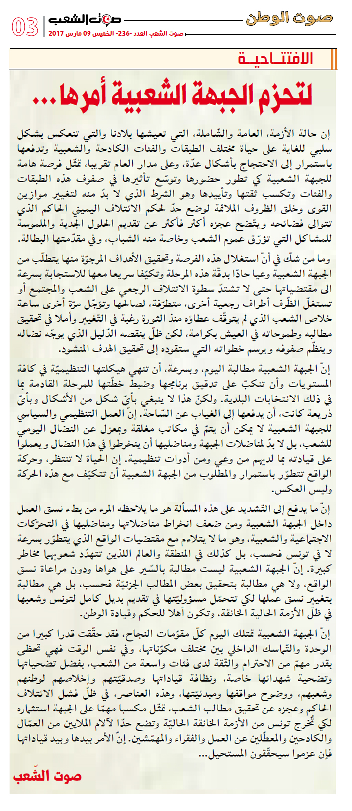 إن حالة الأزمة، العامة والشاملة، التي تعيشها بلادنا والتي تنعكس بشكل سلبي للغاية على حياة مختلف الطبقات والفئات الكادحة والشعبية وتدفعها باستمرار إلى الاحتجاج بأشكال عدّة، وعلى مدار العام تقريبا، تمثّل فرصة هامة للجبهة الشعبية كي تطور حضورها وتوسّع تأثيرها في صفوف هذه الطبقات والفئات وتكسب ثقتها وتأييدها وهو الشرط الذي لا بدّ منه لتغيير موازين القوى وخلق الظروف الملائمة لوضع حدّ لحكم الائتلاف اليميني الحاكم الذي تتوالى فضائحه ويتّضح عجزه أكثر فأكثر عن تقديم الحلول الجدية والملموسة للمشاكل التي تؤرّق عموم الشعب وخاصة منه الشباب، وفي مقدّمتها البطالة.