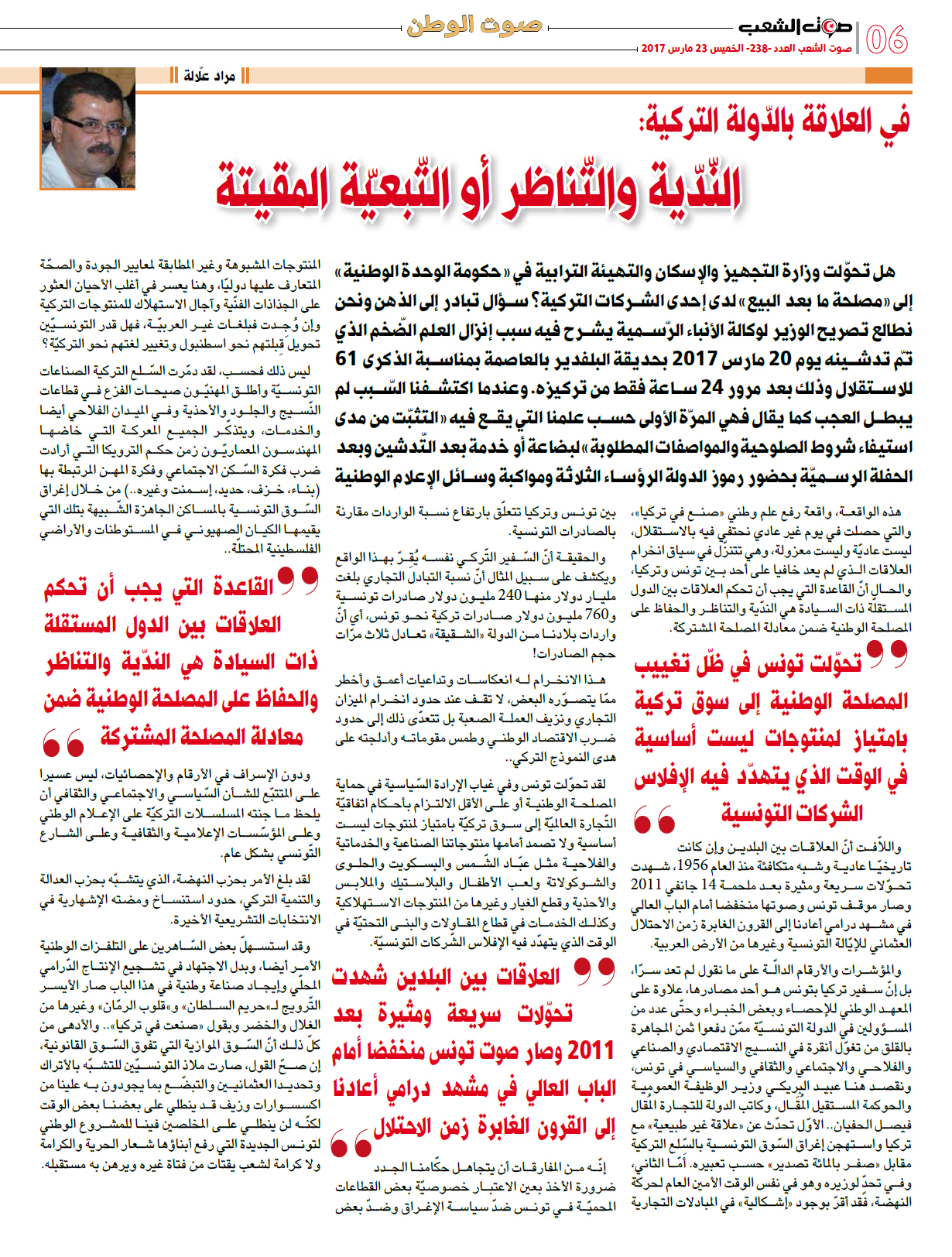 والمؤشرات والأرقام الدالّة على ما نقول لم تعد سرّا، بل إنّ سفير تركيا بتونس هو أحد مصادرها، علاوة على المعهد الوطني للإحصاء وبعض الخبراء وحتّى عدد من المسؤولين في الدولة التونسيّة ممّن دفعوا ثمن المجاهرة بالقلق من تغوّل أنقرة في النسيج الاقتصادي والصناعي والفلاحي والاجتماعي والثقافي والسياسي في تونس، ونقصد هنا عبيد البريكي وزير الوظيفة العمومية والحوكمة المستقيل المُقَال، وكاتب الدولة للتجارة المُقال فيصل الحفيان.. الأوّل تحدّث عن “علاقة غير طبيعية” مع تركيا واستهجن إغراق السّوق التونسية بالسِّلع التركية مقابل “صفر بالمائة تصدير” حسب تعبيره. أمّا الثاني، وفي تحدٍّ لوزيره وهو في نفس الوقت الأمين العام لحركة النهضة، فقد أقرّ بوجود “إشكالية” في المبادلات التجارية بين تونس وتركيا تتعلّق بارتفاع نسبة الواردات مقارنة بالصادرات التونسية.