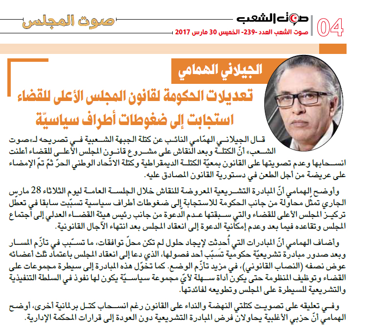 وأوضح الهمامي أنّ المبادرة التشريعية المعروضة للنقاش خلال الجلسة العامة ليوم الثلاثاء 28 مارس الجاري تمثّل محاولة من جانب الحكومة للاستجابة إلى ضغوطات أطراف سياسية تسبّبت سابقا في تعطّل تركيز المجلس الأعلى للقضاء والتي سبقتها عدم الّدعوة من جانب رئيس هيئة القضاء العدلي إلى اجتماع المجلس وتقاعده فيما بعد وعدم إمكانية الدعوة إلى انعقاد المجلس بعد انتهاء الآجال القانونية.