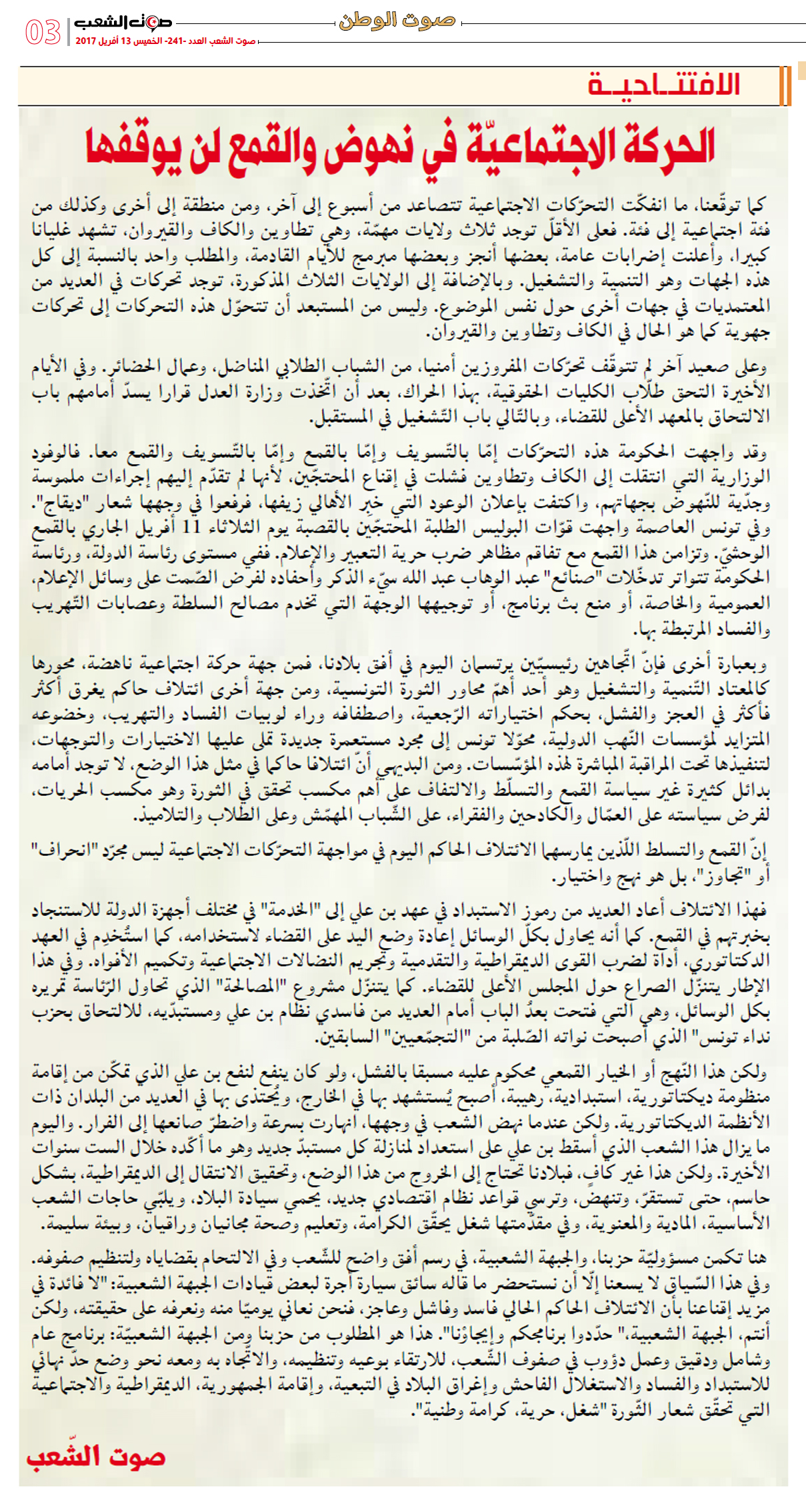 وبعبارة أخرى فإنّ اتّجاهين رئيسيّين يرتسمان اليوم في أفق بلادنا، فمن جهة حركة اجتماعية ناهضة، محورها كالمعتاد التّنمية والتشغيل وهو أحد أهمّ محاور الثورة التونسية، ومن جهة أخرى ائتلاف حاكم يغرق أكثر فأكثر في العجز والفشل، بحكم اختياراته الرّجعية، واصطفافه وراء لوبيات الفساد والتهريب، وخضوعه المتزايد لمؤسسات النّهب الدولية، محوّلا تونس إلى مجرد مستعمرة جديدة تملى عليها الاختيارات والتوجهات، لتنفيذها تحت المراقبة المباشرة لهذه المؤسّسات. ومن البديهي أنّ ائتلافا حاكما في مثل هذا الوضع، لا توجد أمامه بدائل كثيرة غير سياسة القمع والتسلّط والالتفاف على أهم مكسب تحقق في الثورة وهو مكسب الحريات، لفرض سياسته على العمّال والكادحين والفقراء، على الشّباب المهمّش وعلى الطلاب والتلاميذ.