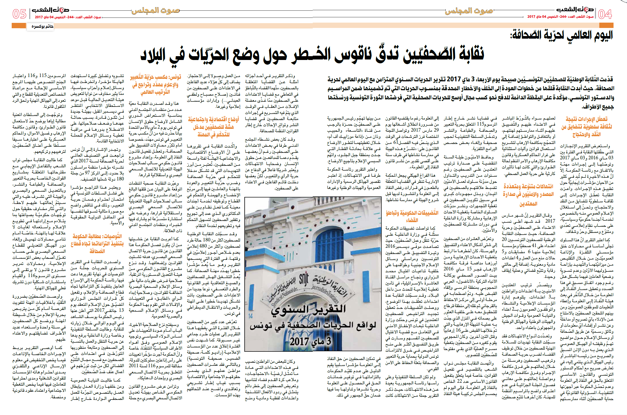 قدّمت النّقابة الوطنيّة للصحفيّين التونسيّين صبيحة يوم الأربعاء 3 ماي 2017 تقرير الحريات السنوي المتزامن مع اليوم