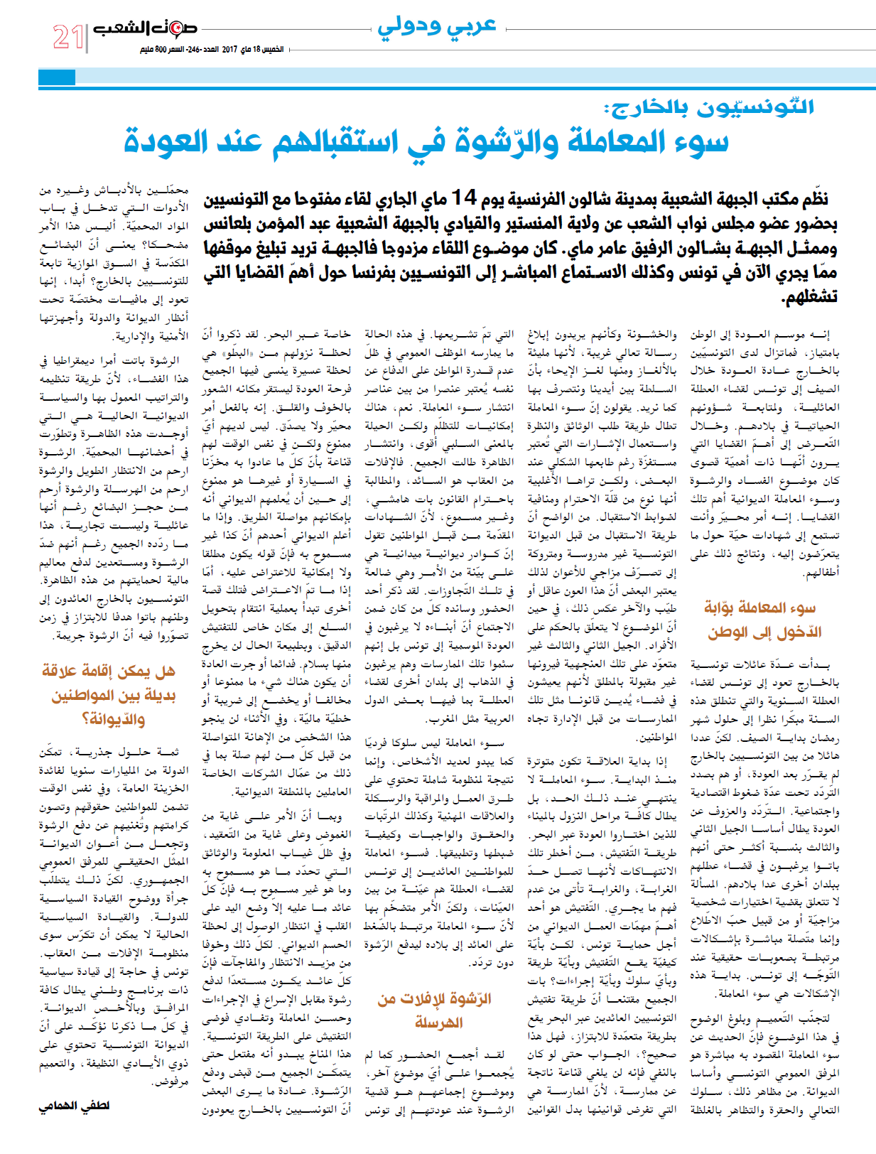 إنه موسم العودة إلى الوطن بامتياز، فماتزال لدى التونسيّين بالخارج عادة العودة خلال الصيف إلى تونس لقضاء العطلة العائلية، ولمتابعة شؤونهم الحياتية في بلادهم. وخلال التّعرض إلى أهمّ القضايا التي يرون أنّها ذات أهميّة قصوى كان موضوع الفساد والرشوة وسوء المعاملة الديوانية أهم تلك القضايا. إنه أمر محيّر وأنت تستمع إلى شهادات حيّة حول ما يتعرّضون إليه، ونتائج ذلك على أطفالهم.