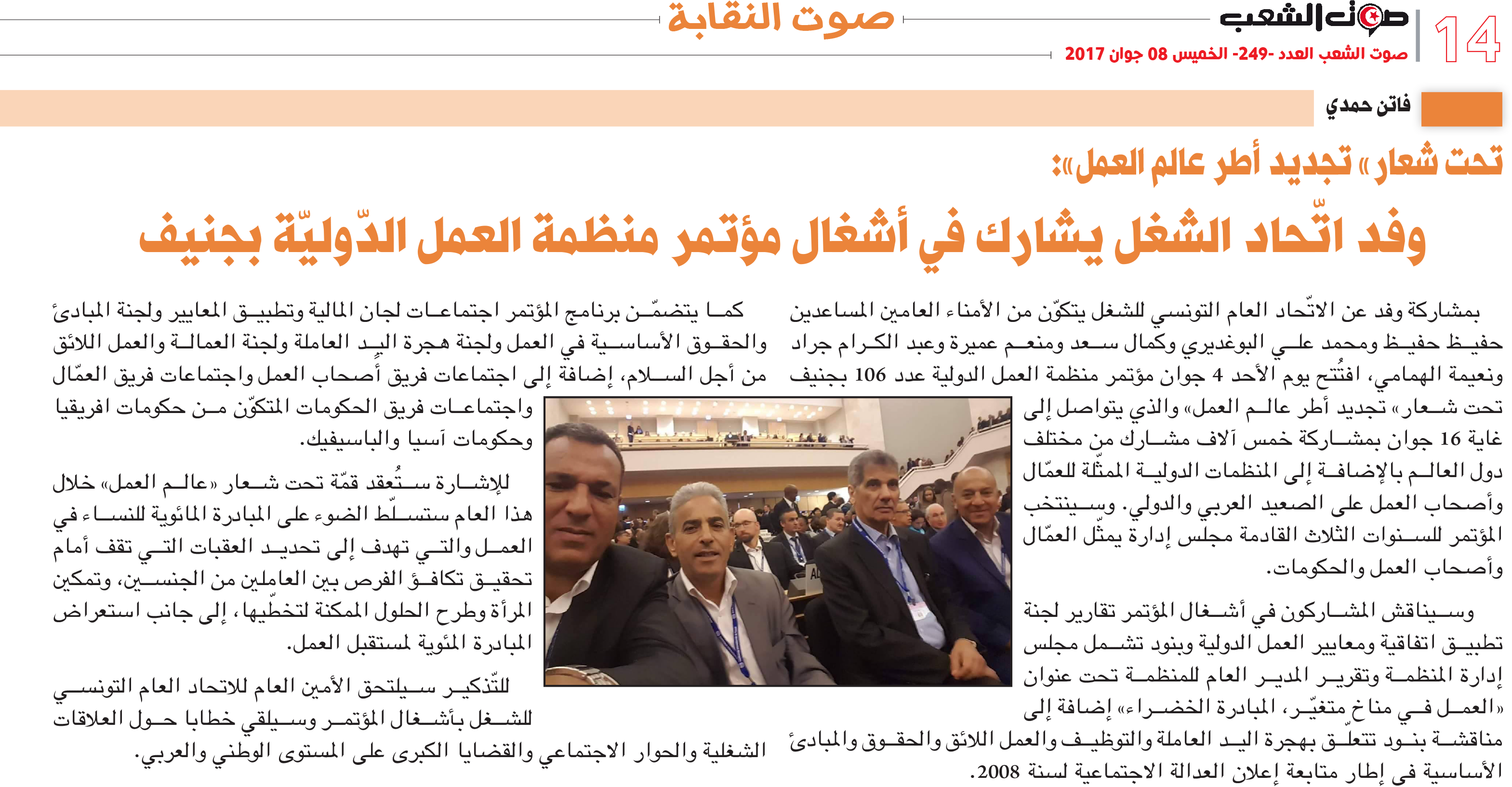 الهمامي، افتُتح يوم الأحد 4 جوان مؤتمر منظمة العمل الدولية عدد 106 بجنيف تحت شعار” تجديد أطر عالم العمل” والذي يتواصل إلى غاية 16 جوان بمشاركة خمس آلاف مشارك من مختلف دول العالم بالإضافة إلى المنظمات الدولية الممثّلة للعمّال وأصحاب العمل على الصعيد العربي والدولي. وسينتخب المؤتمر للسنوات الثلاث القادمة مجلس إدارة يمثّل العمّال وأصحاب العمل والحكومات.