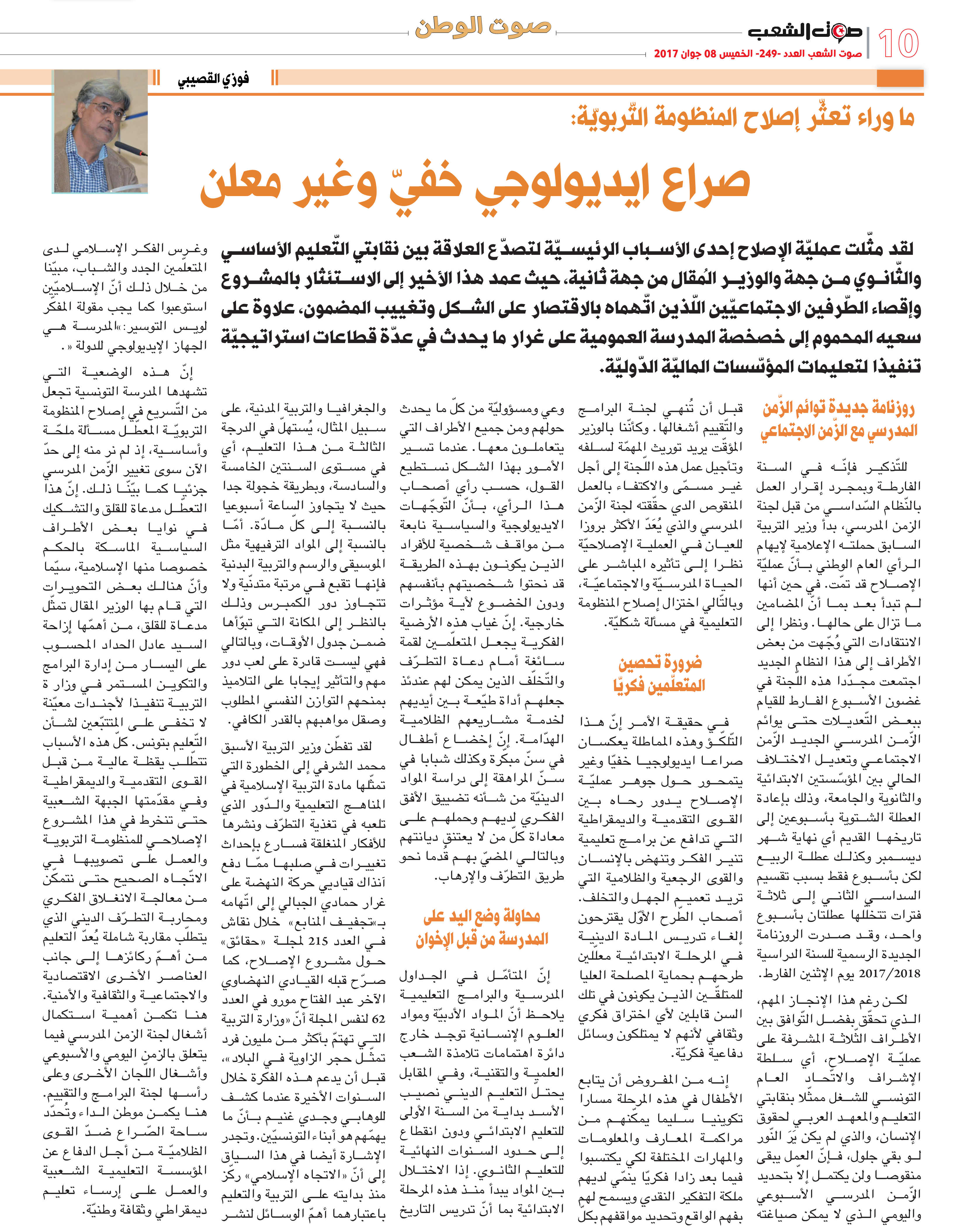 كلّ هذه الأسباب تتطّلب يقظة عالية من قبل القوى التقدمية والديمقراطية وفي مقدّمتها الجبهة الشعبية حتى تنخرط في هذا المشروع الإصلاحي للمنظومة التربوية والعمل على تصويبها في الاتّجاه الصحيح حتى نتمكّن من معالجة الانغلاق الفكري ومحاربة التطرّف الديني الذي يتطلّب مقاربة شاملة يُعدّ التعليم من أهمّ ركائزها إلى جانب العناصر الأخرى الاقتصادية والاجتماعية والثقافية والأمنية. هنا تكمن أهمية استكمال أشغال لجنة الزمن المدرسي فيما يتعلق بالزمن اليومي والأسبوعي وأشغال اللّجان الأخرى وعلى رأسها لجنة البرامج والتقييم. هنا يكمن موطن الداء وتُحدّد ساحة الصّراع ضدّ القوى الظلاميّة من أجل الدفاع عن المؤسسة التعليمية الشعبية والعمل على إرساء تعليم ديمقراطي وثقافة وطنيّة.