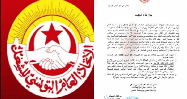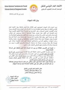قرّرت الجامعة العامة للتعليم الثانوي استئناف الدّروس غدا الأربعاء 25 أفريل 2018 بداية من الساعة الثامنة صباحا بناء على مقرّرات لقاء الجهات الذي انتظم اليوم الثلاثاء بمقر الاتّحاد العام التونسي للشغل.