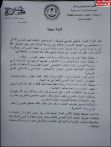 عبّرت النقابة الأساسيّة لأعوان وموظّفي الدّيوان الوطني التونسي للسياحة التابعة للجامعة العامة للصناعات الغذائيّة والسياحة والتجارة والصناعات التقليديّة في لائحة مهنيّة على إثر اجتماع عام التأم اليوم الجمعة 29 جوان بمقر العمل (شارع الحرية)، تحصّلت صوت الشعب على نسخة منه، عن استعداد الأعوان للدّخول في تحرّكات احتجاجيّة بما فيها الإضراب، في صورة عدم الاستجابة للمطالب.