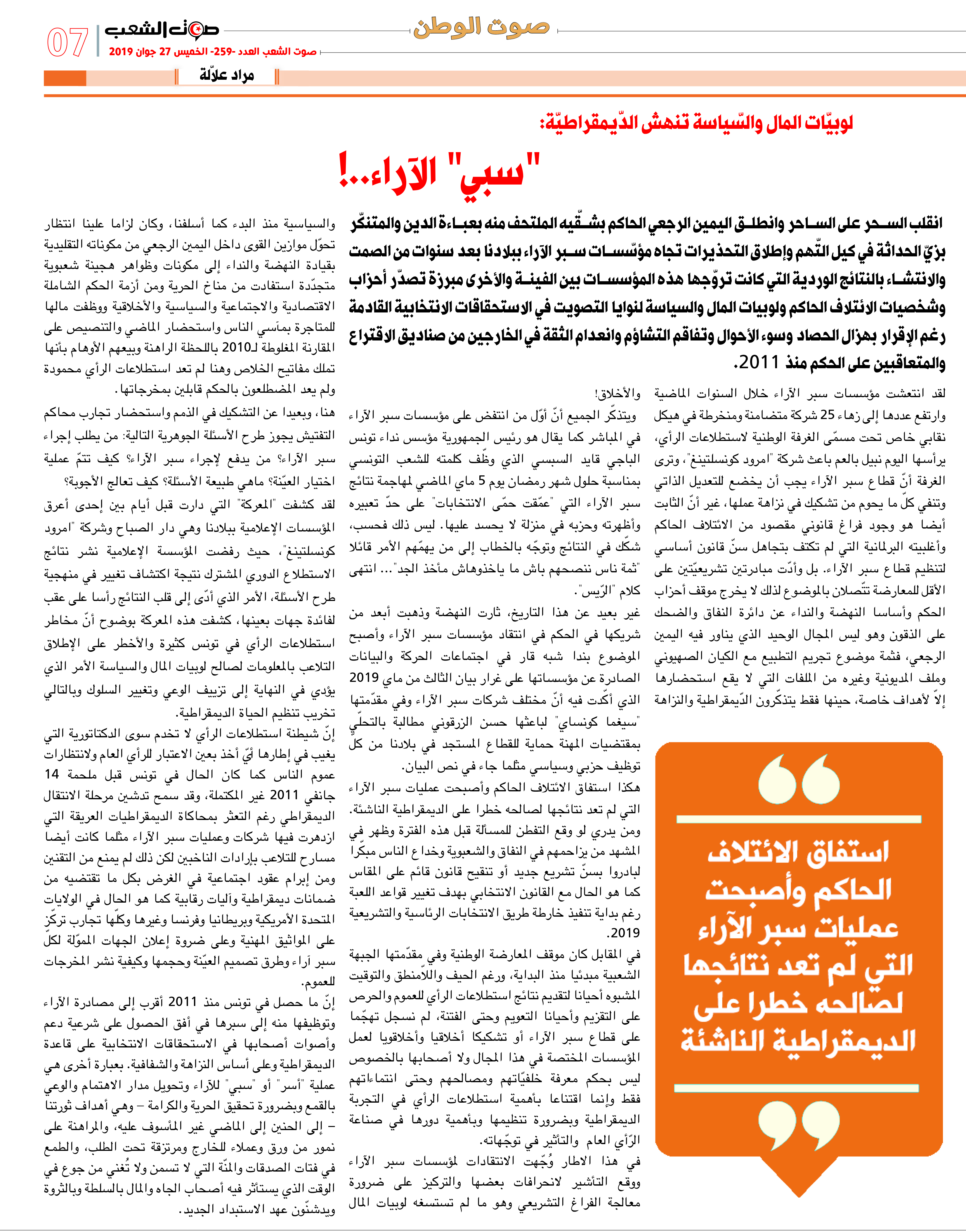 في هذا الاطار وُجّهت الانتقادات لمؤسسات سبر الآراء ووقع التأشير لانحرافات بعضها والتركيز على ضرورة معالجة الفراغ التشريعي وهو ما لم تستسغه لوبيات المال والسياسية منذ البدء كما أسلفنا، وكان لزاما علينا انتظار تحوّل موازين القوى داخل اليمين الرجعي من مكوناته التقليدية بقيادة النهضة والنداء إلى مكونات وظواهر هجينة شعبوية متجدّدة استفادت من مناخ الحرية ومن أزمة الحكم الشاملة الاقتصادية والاجتماعية والسياسية والأخلاقية ووظفت مالها للمتاجرة بمآسي الناس واستحضار الماضي والتنصيص على المقارنة المغلوطة لـ2010 باللحظة الراهنة وبيعهم الأوهام بأنها تملك مفاتيح الخلاص وهنا لم تعد استطلاعات الرأي محمودة ولم يعد المضطلعون بالحكم قابلين بمخرجاتها.