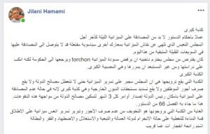 ونوّه الجيلاني بما ورد في الفصل عدد 66 من الدستور التونسي الذي ينصّ على أنّ رئيس الدولة بإمكانه إصدار أوامر كلّ 3 أشهر من أجل دفوعات الدولة وهو ما يفنّد كل التبريرات التي أطلقها البرلمان كحجّة على المصادقة على الميزانية حتى دون مناقشة فصولها.
