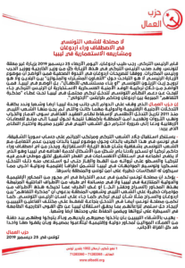 إن حزب العمال الذي وقف على الدوام إلى جانب وحدة ليبيا أرضا وشعبا وندد بكافة التدخلات الأجنبية الإقليمية والدولية مهما كانت والتي لم يجن منها الشعب الليبي منذ 2011 تاريخ التدخل الأطلسي لإسقاط نظام العقيد القذافي سوى الدمار والخراب ونهب الثروات وتهديد أمن المنطقة بأكملها نتيجة تحول ليبيا إلى مرتع للعصابات الإرهابية ودعا إلى ضرورة احترام حق الشعب الليبي في تقرير مصيره واختيار النظام الذي يريد: