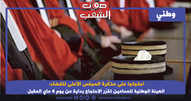 تعليقا على المذكّرة الصادرة عن المجلس الأعلى للقضاء أمس، قرّرت الهيئة الوطنية للمحامين في بيانها الصادر اليوم الأربعاء الدخول في تحرّكات احتجاجية بداية من يوم 4 ماي المقبل من أجل إقرار عودة المنظمة إلى العمل بروزنامة واضحة مع تشريكها في اتخاذ القرار.