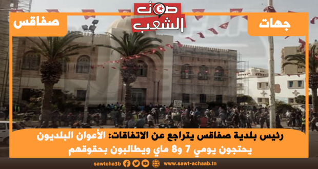 إثر قرار وزير الدولة المكلّف برئاسة الحكومة محمد عبّو باقتطاع يوم عمل وسحب تذاكر الأكل بالوظيفة العمومية رفض رئيس بلدية صفاقس منير اللّومي الترفيع في منحة عيد الفطر للأعوان البلديين المباشرين، أكّد الكاتب العام للنقابة الأساسية لأعوان وموظفّي بلدية صفاقس النوري بلحسن تنفيذ وقفتين احتجاجيتين يومي 7 و8 ماي الجاري أمام مقرّات العمل بصفاقس الكبرى رفضا لقرار رئيس البلدية وللمطالبة بالالتزام بالاتّفاقات السابقة مع الطرف النقابي.
