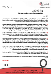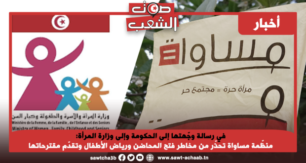 نشرت الصفحة الرّسمية لمنظّمة “مساواة” صباح اليوم الإثنين 11 ماي نصّ رسالة مفتوحة وجّهتها إلى كلّ من رئيس الحكومة والسّيّدة وزيرة المرأة والأسرة والطّفولة وكبار السّنّ على خلفيّة لقاء الوزيرة بكلّ من السيد طارق الشريف رئيس كنفدرالية المؤسسات (كوناكت) والسّيدة نبيلة ميلادي رئيسة المجمع المهني لمحاضن ورياض الأطفال بخصوص موضوع إمكانية فتح مؤسسات الطفولة بالقطاع الخاص والتي تضرّرت ماديا بسبب جائحة كورونا .