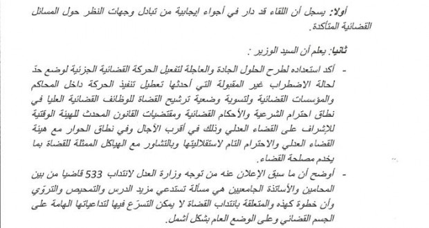 أولا: يسجل أن اللقاء قد دار في أجواء إيجابية من تبادل وجهات النظر حول المسائل القضائية المتأكدة.