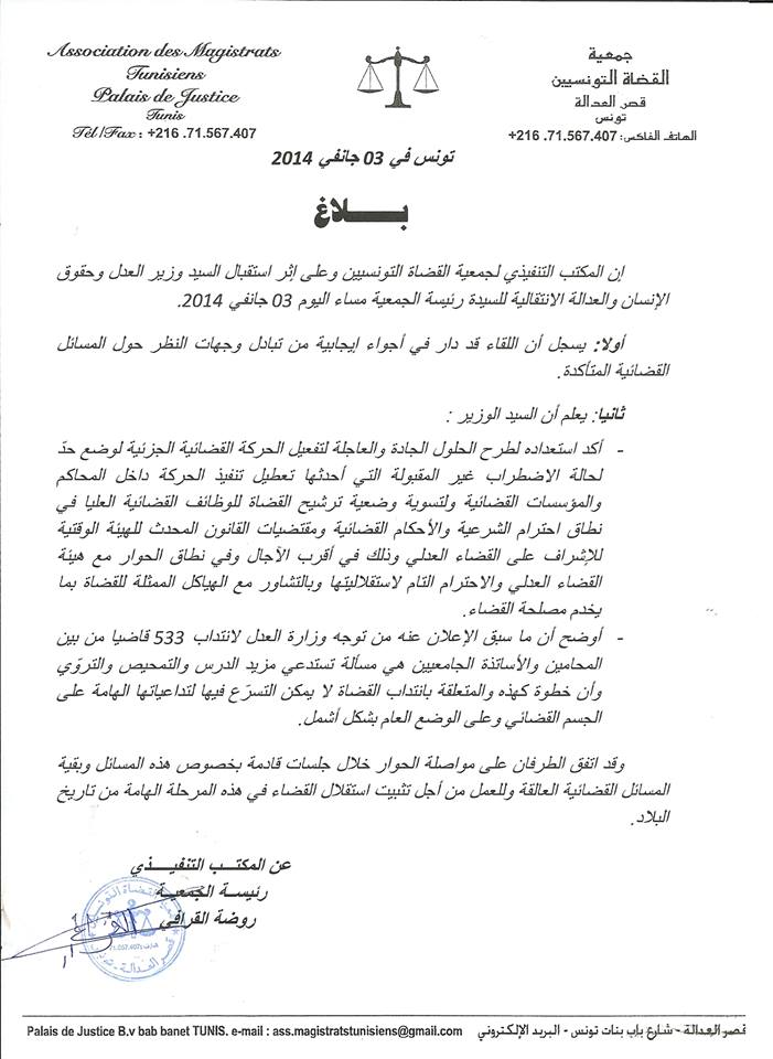 إن المكتب التنفيذي لجمعية القضاة التونسيين وعلى إثر استقبال السيد وزير العدل وحقوق الإنسان والعدالة الانتقالية للسيدة رئيسة الجمعية مساء اليوم 03 جانفي 2014.