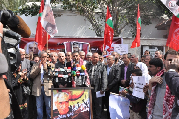وألقى عضو اللجنة المركزية العامة للجبهة الشعبية لتحرير فلسطين والأسير المحرر الرفيق علام كعبي كلمة الجبهة قال فيها: ” في الرابع عشر من آذار 2006 أقدمت قوات العدو الصهيوني على اقتحام سجن أريحا المركزي واختطاف الرفيق الأمين العام أحمد سعدات ورفاقه عاهد أبو غلمى ومجدي الريماوي، وحمدي قرعان، وباسل الأسمر، ومعهم المناضل فؤاد الشوبكي الذين كانوا تحت ” الحماية” والرقابة من قبل قوات بريطانية وأمريكية، مما يؤكد على المدى الذي أظهره توظيف الأجهزة الأمنية للسلطة في تنفيذ سياسات لا تخدم صمود ومقاومة الشعب الفلسطيني، في إطار التزامات اتفاق أوسلو الذي جرى تصميمه لتفتيت وحدة الشعب الفلسطيني ومشروعه الوطني التحرري وتقويض حقوقه، ولترسيخ ثقافة التطبيع مع الاحتلال وسياساته التي خبرها الشعب الفلسطيني والشعوب العربية على مدى العقود الماضية”.