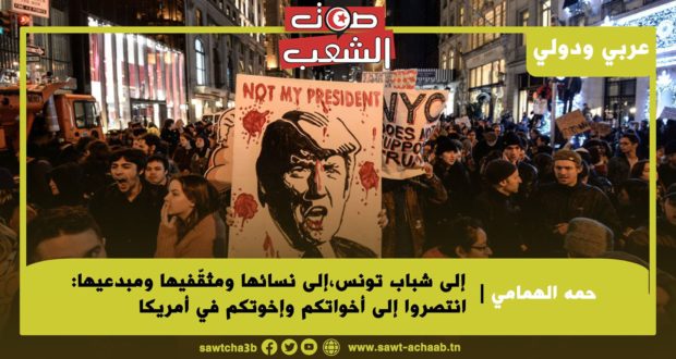 يا شبابَ تونس ويَا كادحيها ونساءها ومثقّفيها ومُبْدِعيها… انتصروا لأخواتِكُم/كُنّ وإخوتكُم/كُنّ في أمريكا… فأنتم/تُنّ بذلك تنتصرون/تنتصرن لأنفسكُم/كُنّ…