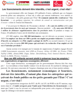 غير أنّ الحكومة الفرنسية السّخيّة لم تحرّك ساكنا لكفّ الطرد الجماعي الذي لم تتردّد الشركات الكبرى عن الإعلان عنه مباشرة بعد حصولها على المساعدات المالية (مصنّع الطائرات “إيرباص” تحصّل على 8 مليار يورو وأعلنت عن طرد أكثر من 10000 عامل في مجمع شركاتها والشركات المناولة، مصنّع السيارات “رينو” تحصّل على 5 مليار يورو وينوي طرد 4500 عامل في فرنسا…). بل إنّ الرئيس الفرنسي كان له من الوقاحة أن يعلن يوم العيد الوطني الفرنسي (14 جويلية 2020) عن إمكانيّة طرد أكثر من مليون عامل خلال سنة 2021، بما ينذر بتعميق الأزمة الاجتماعية والسياسية في البلاد.